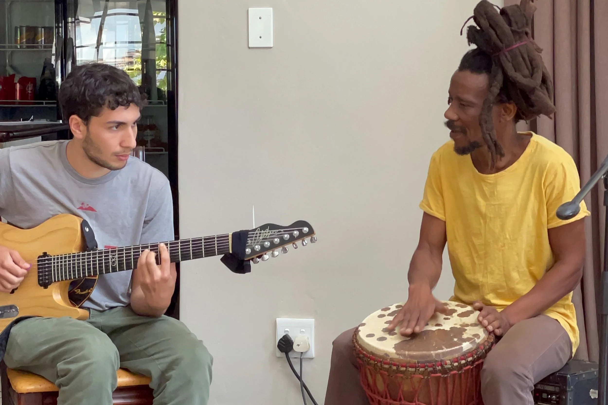 Mandla Mantsha (R) teaching on the Djembe drum at the NEWF Compose Yourself Lab