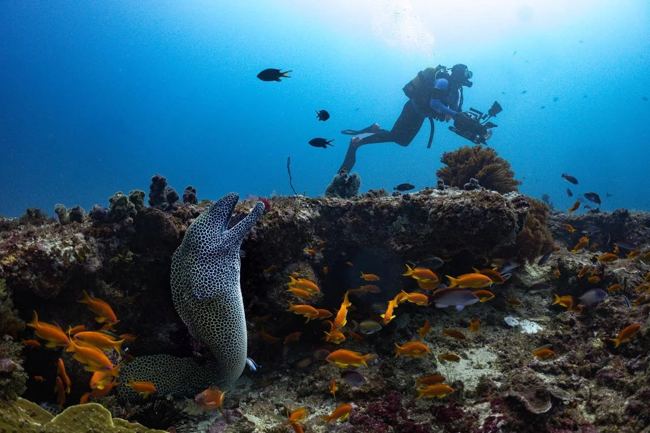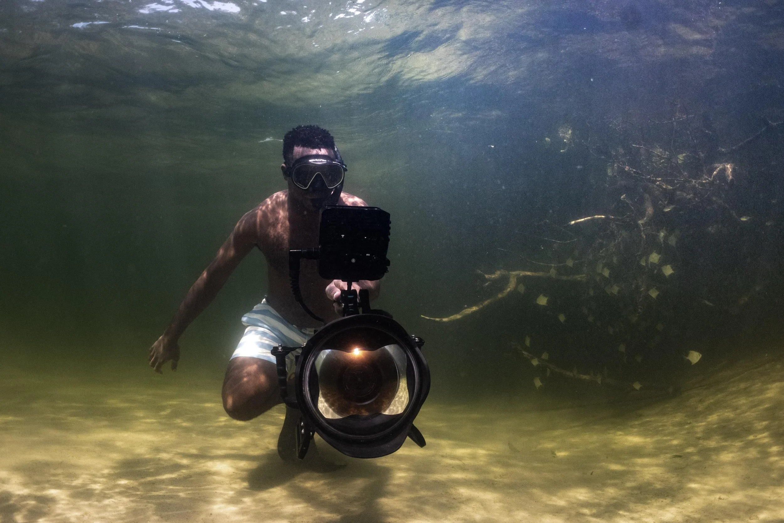 Nkosi filming underwater, Photograph by Dercio Muha Gomate.